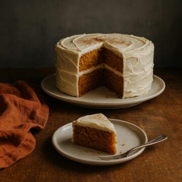 A moist, spiced 2-layer pumpkin cake baked in 9-inch pans, finished with a nutty, rich brown butter cream cheese frosting. Perfect for fall gatherings, holidays, or Thanksgiving.