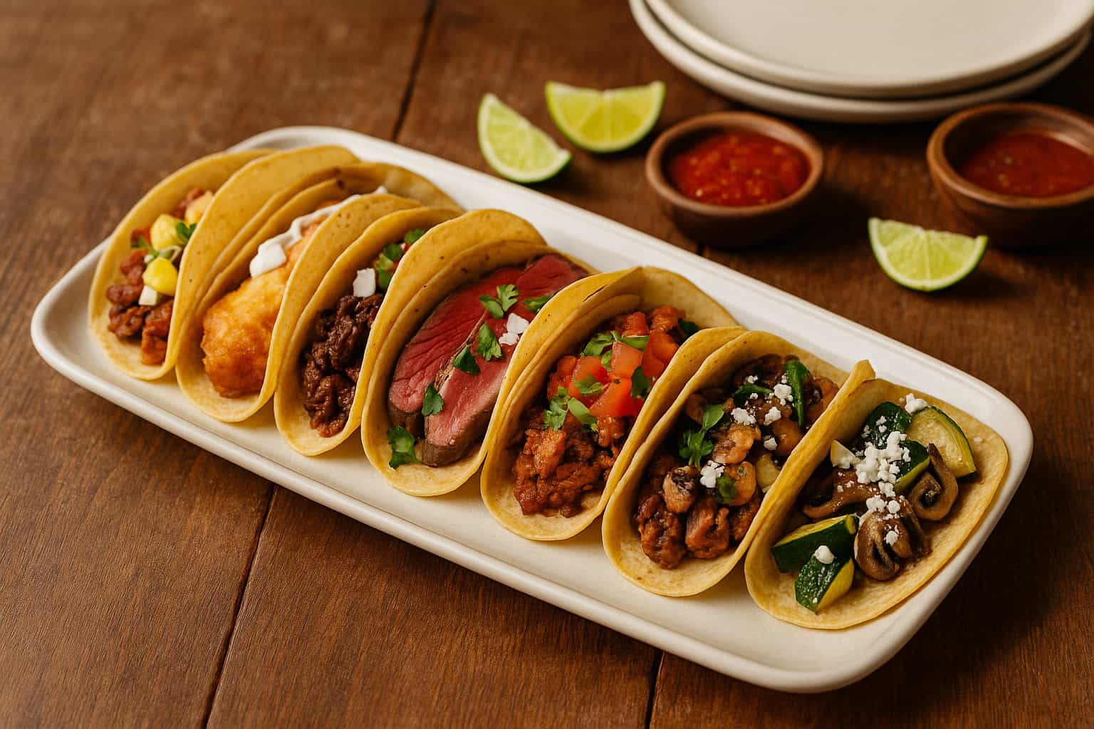 - Condiments: salsas, crema, pickled vegetables
